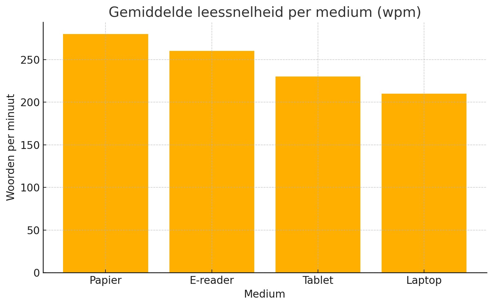 Toelichting bij de grafiek: De weergegeven leessnelheden zijn gebaseerd op gemiddelden voor ongeoefende lezers. Dat wil zeggen: lezers zonder specifieke training in snellezen of andere leesstrategieën. De verschillen tussen de media zijn gebaseerd op trends uit wetenschappelijk onderzoek, waarbij lezen van papier doorgaans het snelst en meest comfortabel is.