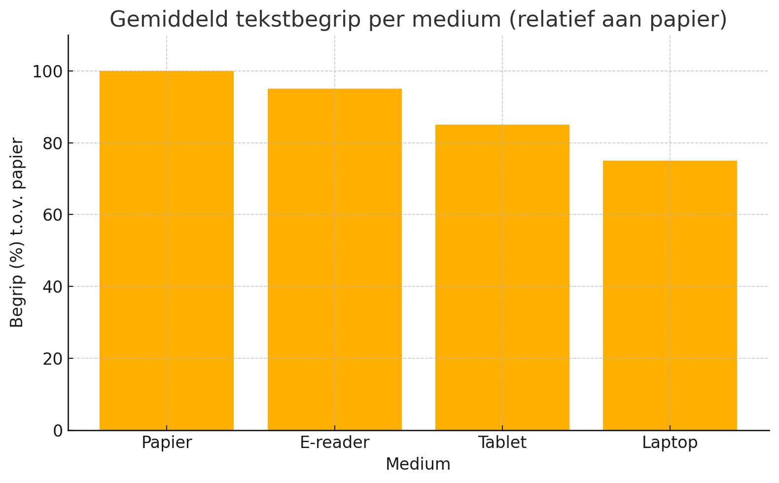 Toelichting bij de grafiek: De score van 100% begrip bij papier betekent niet dat je áltijd alles begrijpt wat je leest op papier. Het is een referentiewaarde: in wetenschappelijk onderzoek wordt papier vaak gebruikt als standaard, omdat mensen daarop gemiddeld het beste scoren in tekstbegrip.